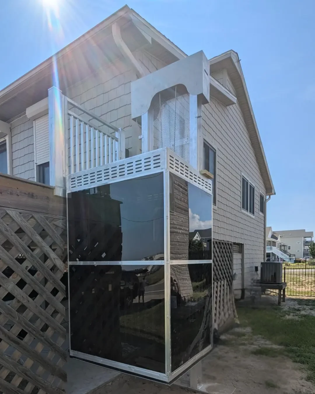 The Fully Enclosed with Roof Carolina Lift from Home Elevators and Lift has a beautiful design that gives you protection from the elements. This is our premier option offered with all the bells and whistles. This enclosed lift with a roof comes with overhead lights and protection from the sun with ANSI Z97.1 acrylic lexan.