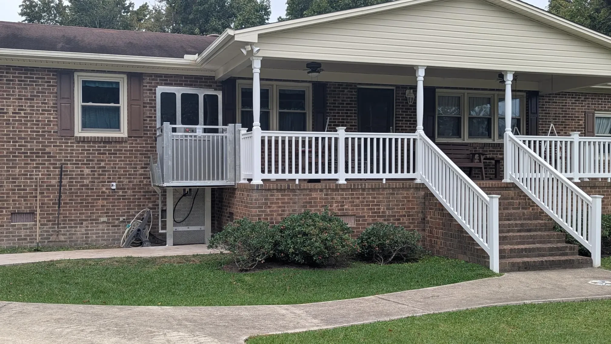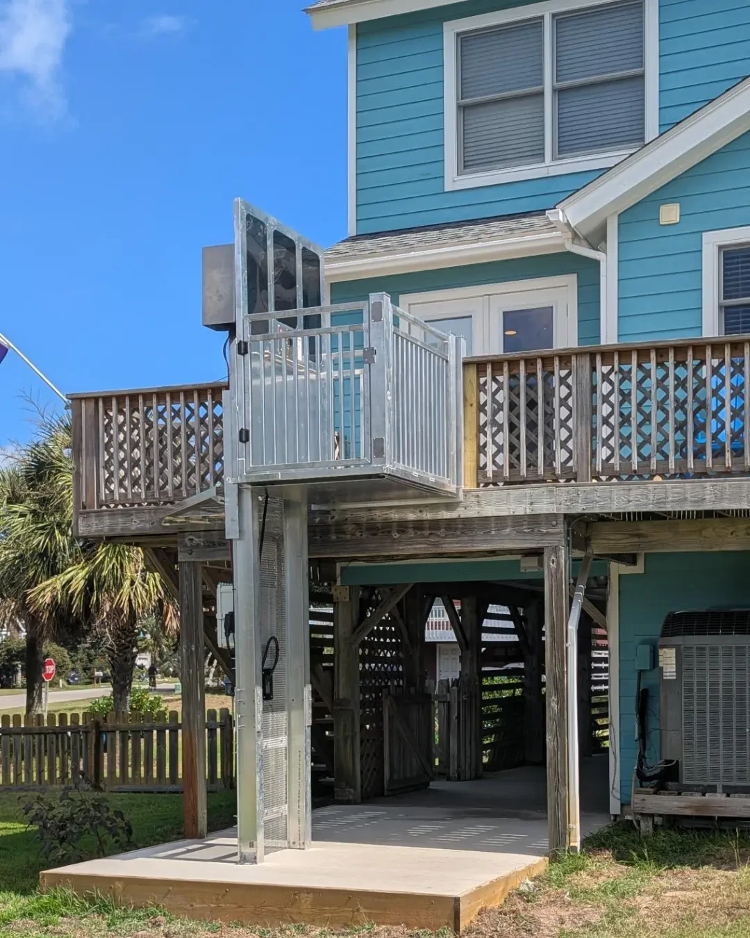 The Open Cab Carolina Lift from Home Elevators and Lift comes with two options: single side on and off, or pass-thru. The open cab lift is our standard model and the most cost-efficient option. It comes with aluminum picket railing as standard, but can be upgraded to an overlayed tinted ANSI Z97.1 acrylic lexan.
